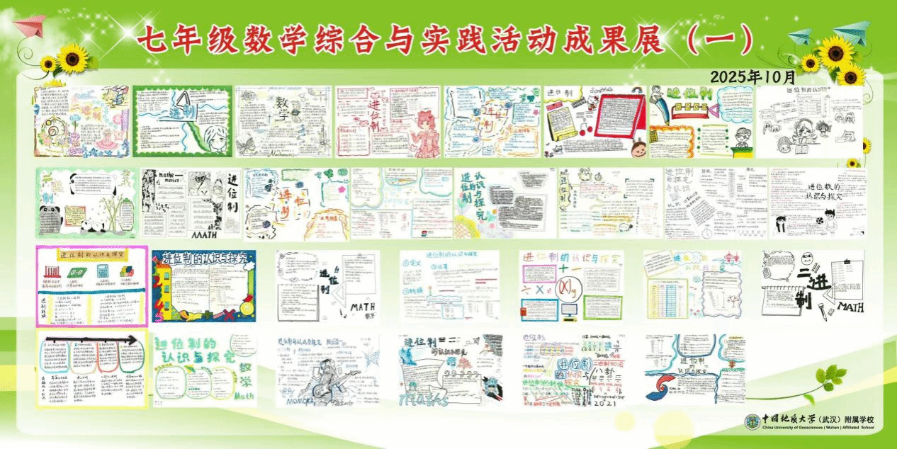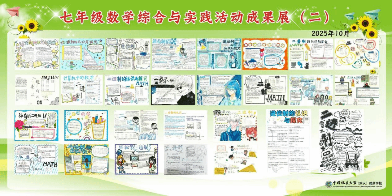 (通讯员:尹书丽)金秋十月,丹桂飘香。在刚刚过去的国庆假期里,我校七年级的同学们完成了一项别开生面的数学实践作业。一份份图文并茂、色彩绚丽的数学小报,在假期后惊艳亮相,不仅在全年级评比中脱颖而出,更化身为一场名为“七年级数学综合与实践活动成果展:计算机中的数字——二进制的认识与探究”的视觉与思维盛宴,赢得了广大师生和校领导的一致赞誉。