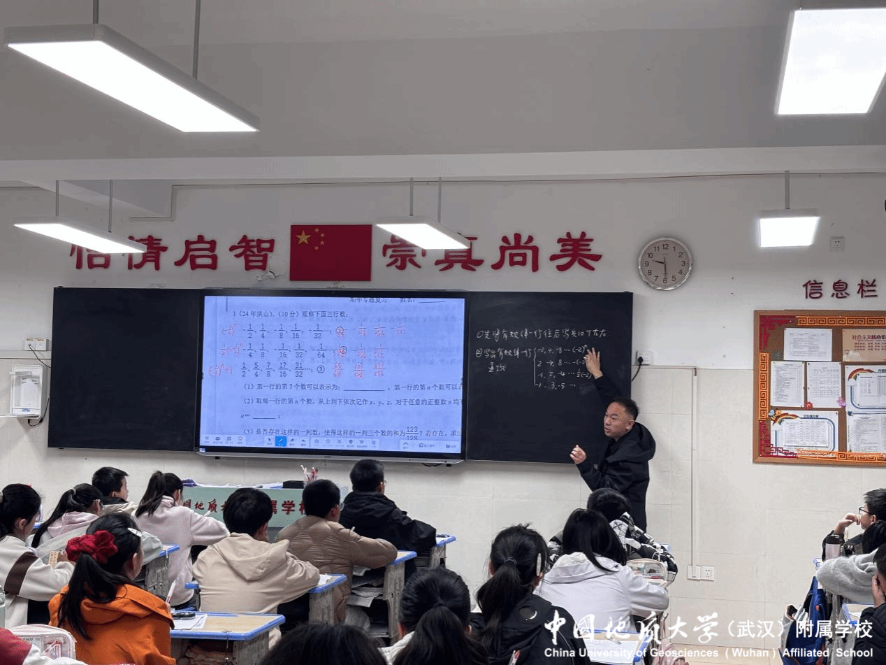 地大附校七年级方海兵老师以《三行数的规律》为主题,开设期中复习课。针对该模块重难点,方老师通过“精讲典型例题+系统步骤拆解”的方式,用五大步骤引导学生分层突破。整节课逻辑清晰、重点突出,有效提升了两校七年级学生对复杂数列规律问题的分析与解决能力,为期中考试筑牢基础。