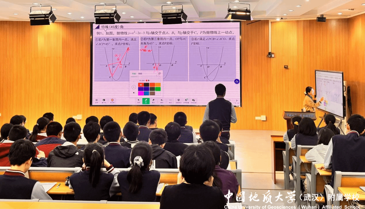 九年级的数学交流课在阶梯教室开展,地大附校张晓芹老师聚焦“二次函数与角度问题”,带领两校九年级学生突破综合题型。课堂围绕“抛物线上动点与45°角、等角、倍角及角的和差关系”展开,张老师引导学生通过“构造等腰三角形”,利用全等或等角代换,将抽象的角度条件转化为具体的线段关系。教学过程从“特殊角求解”逐步过渡到“倍分角应用”,环节环环相扣、难度层层递进,既实现了学生思维的螺旋上升,又帮助他们掌握了“方法迁移”的解题技巧,为应对中考综合题提供了有效思路。