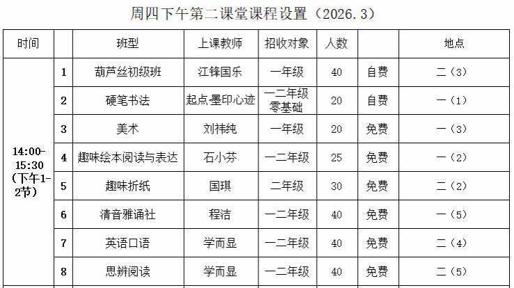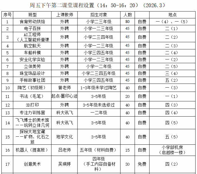 2、周五的课为一到五年级的必修课,每生必选一项,也只能选一项。周五选课系统将于2026年3月12日(周四)19:00-3月13日(周五)10:00期间开放。