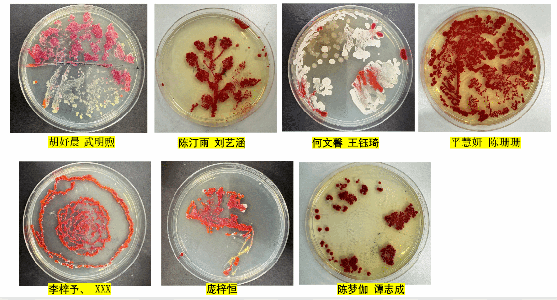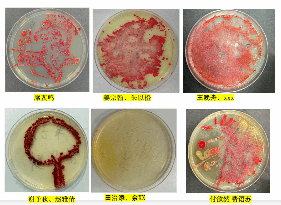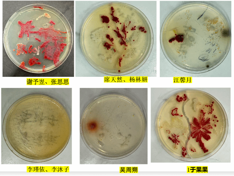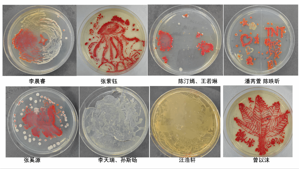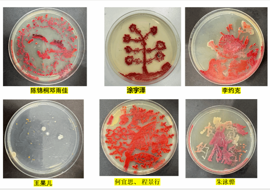 最让人期待的“微生物作画”环节,把课堂推向了高潮。戴上手套的孩子们,小心翼翼地用接种环蘸取不同菌种,在无菌培养皿里勾勒线条:有的画起小树,有的设计星空,有的创作了专属班级徽章,仿佛在微观画布上,挥洒着天马行空的想象力。