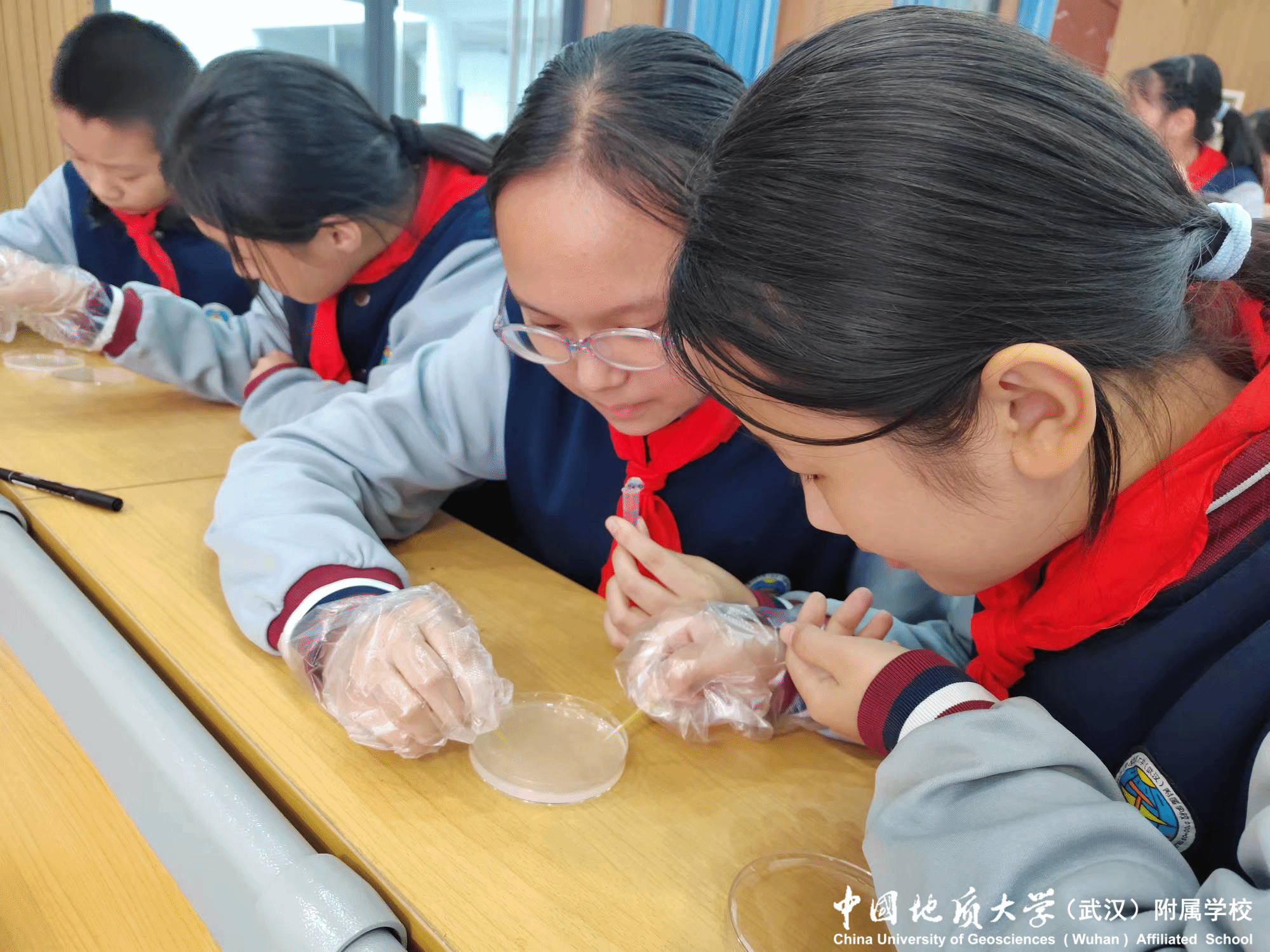 “手要稳,轻轻点——”黄教授在一旁指导,看着培养皿里的“线条”慢慢晕开,孩子们的眼睛里满是雀跃:“等菌落长出来,我的画会变成彩色的吗?”“这是我第一次用细菌当‘颜料’,太酷了!”