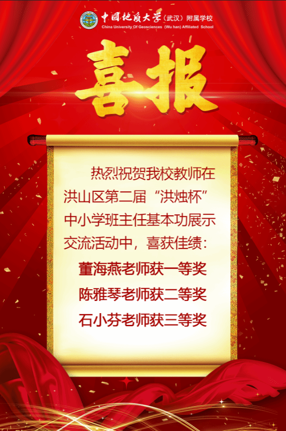 热烈祝贺我校三位班主任在洪山区第二届“洪烛杯”中小学班主任基本功展示交流活动中获奖发布时间:2025-12-24 浏览量: