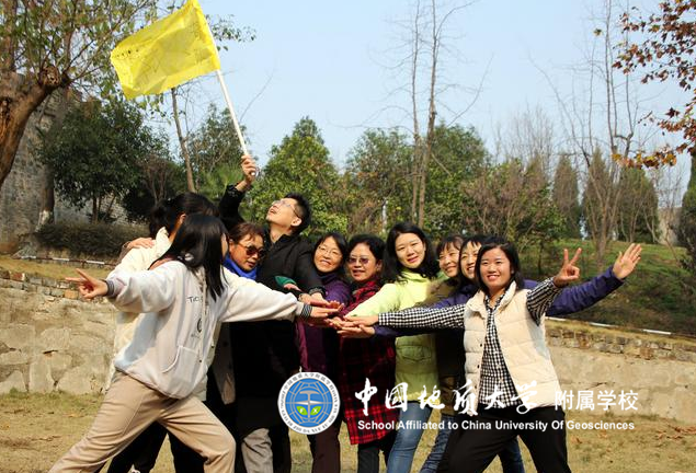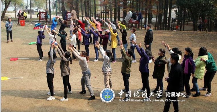 上午的拓展活动由团总支书记冯涛老师和汪情操老师负责。冯书记担任教练工作训练认真,汪裁判严格把关,拓展活动有板有眼,不输专业训练班。首先是破冰开营,听从教练员讲解本次拓展培训活动的各项事宜,接着大家手拉手肩并肩围成一个圆,在教练的指导下时而“花开”(身体向后倒),时而“花落”(身体向前倾);时而“春风吹”(身体向左倾斜),时而“秋风扫”(身体右倾斜)……大家听从指挥,动作一致。紧接着抽签分成三组:红、绿、黄队,每组选拔出队长,组建自己的新团队,设计自己团队的队名,队徽,队旗和口号,大家忙得不亦乐乎,短短十几分钟,三队组建完毕,团队依次上前展示自己的团队文化,团队形象和团队造型,本轮活动由工会主席陈红兰老师点评:她高度评价了三组队名有创意,口号响亮,队徽设计简洁明了有意义,出场展示有气势,都展现良好的团队风貌。