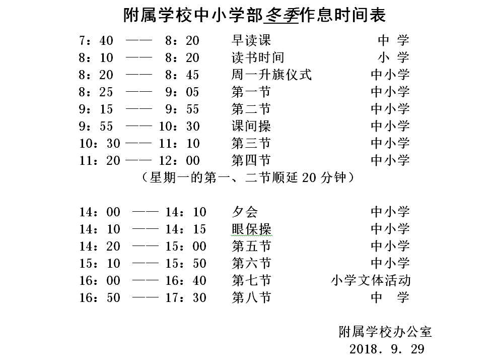 2018年bevictor伟德官方app下载中小学部冬季作息时间表