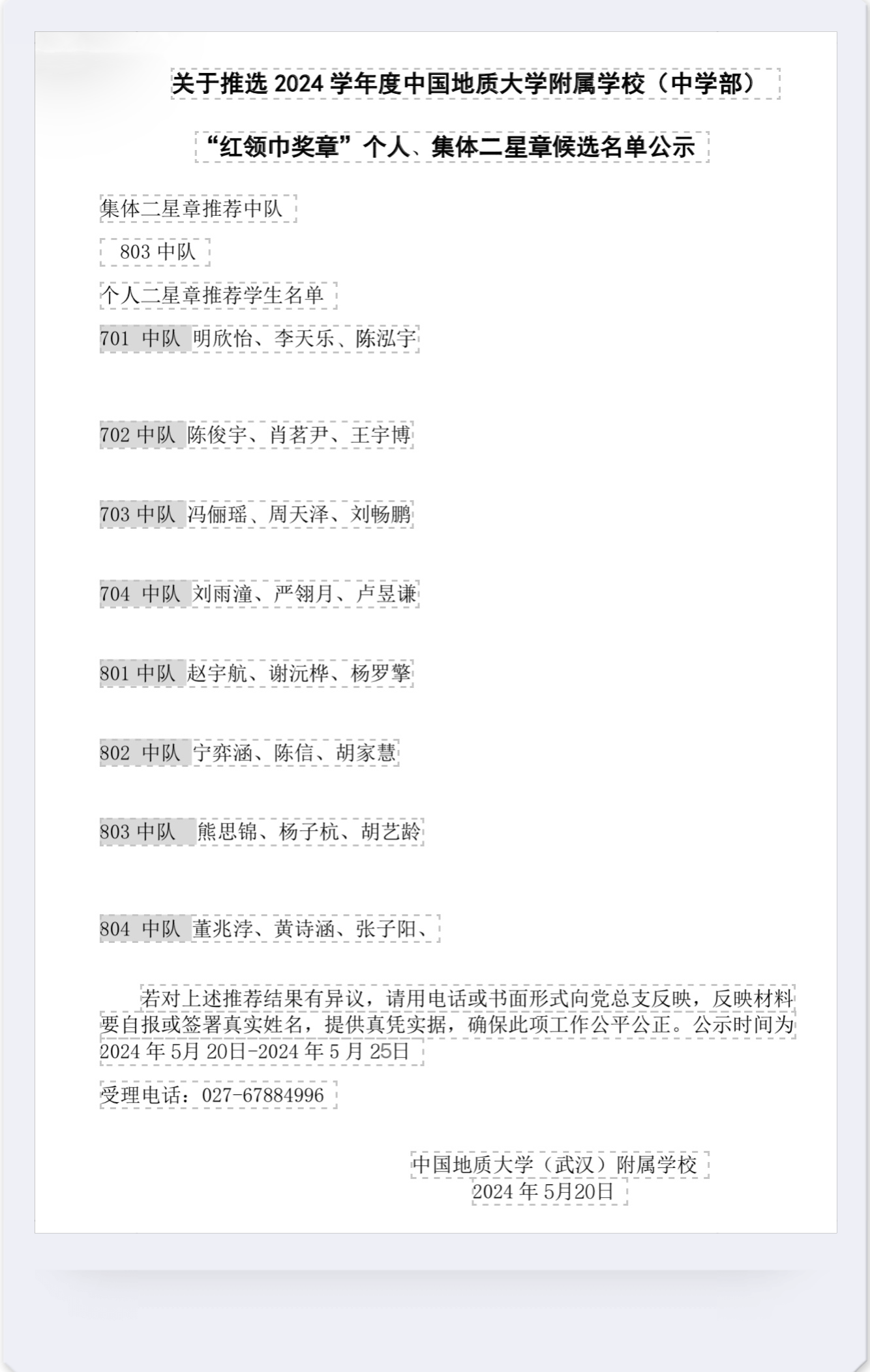 关于推选2024学年度中国地质大学bevictor伟德官方app下载(中学部)“红领巾奖章”个人、集体二星章候选名单公示