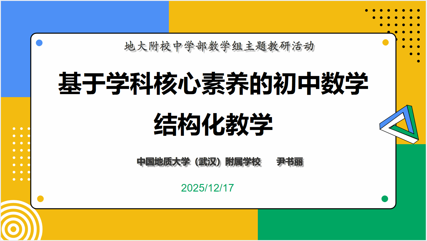 (通讯员:尹书丽)为深化新课标背景下初中数学教学改革,促进学科核心素养落地,12月17日,我校与江夏区土地堂中学、乌龙泉中学联合开展线上教研活动,围绕“基于学科核心素养的初中数学结构化教学”展开专题学习与研讨。